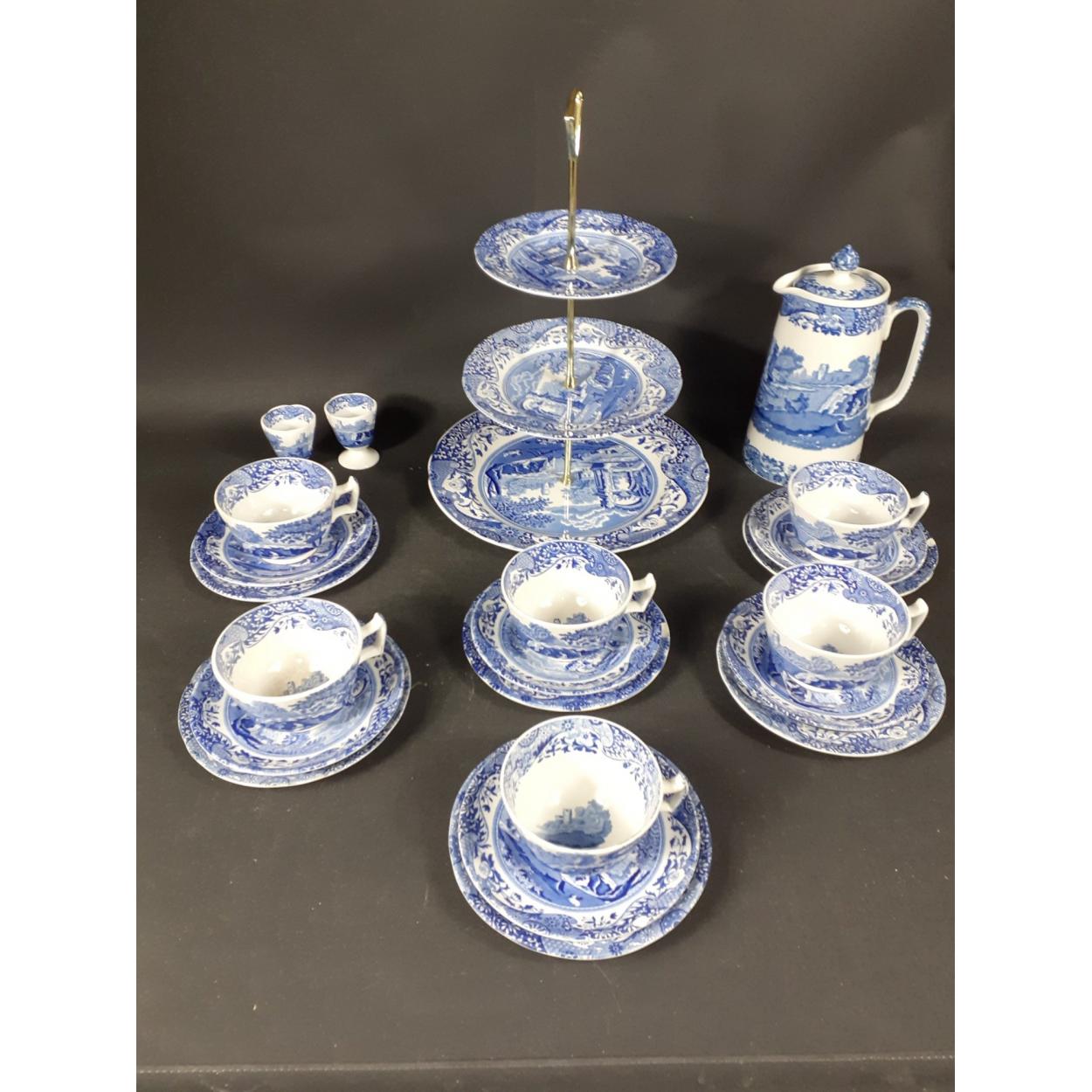 Collection of Copeland SPODE Italian pattern tea service items to include a three tier cake stand, coffee pot, six cups and saucers, six side plates and two egg cups. One chipped and one cracked cup otherwise condition good.