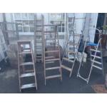 FOUR SETS….. yes I said FOUR SETS OF HOUSEHOLD DIY ladders - two wooden sets to include a 6 step and a four step, also a royal blue coloured 5 step fold-out pair and an ALUMINIUM 4 step fold-out ladders