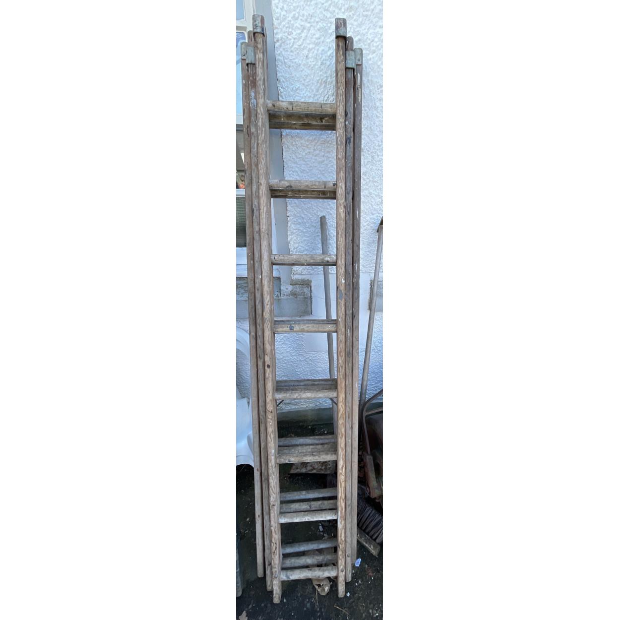 A VINTAGE triple set of extending wooden ladders 24 step