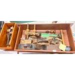 An interesting wooden box & old drawer of antique and vintage tools, including a really old Adjustable STILSONS spanner/wrench, a double sided copper & Hide Panel Beating Hammer, 2 brass & wood spirit levels, A mortice and marker gauge, a nylon hammer, vintage socket sets, corkscrew bradawls etc PLUS - an old drawer full of Vintage woodworking tools, including a superb working Antique Archimedes Hand Drill, 3 Vintage block planes with blades (Very Large, Medium & Small), Antique Moulding/Edge Plane with 9 separate Chisels, Vintage Coopers Mallet, Hand drill etc