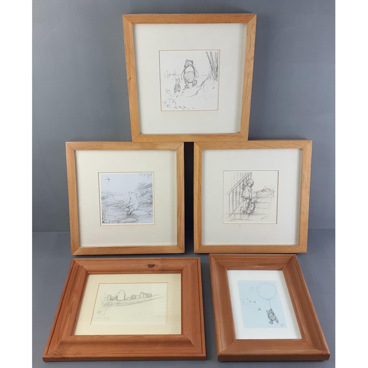 WINNIE THE POOH interest. A super little group of five attractive wood framed prints in good condition. Sweet, sentimental and a lovely display.