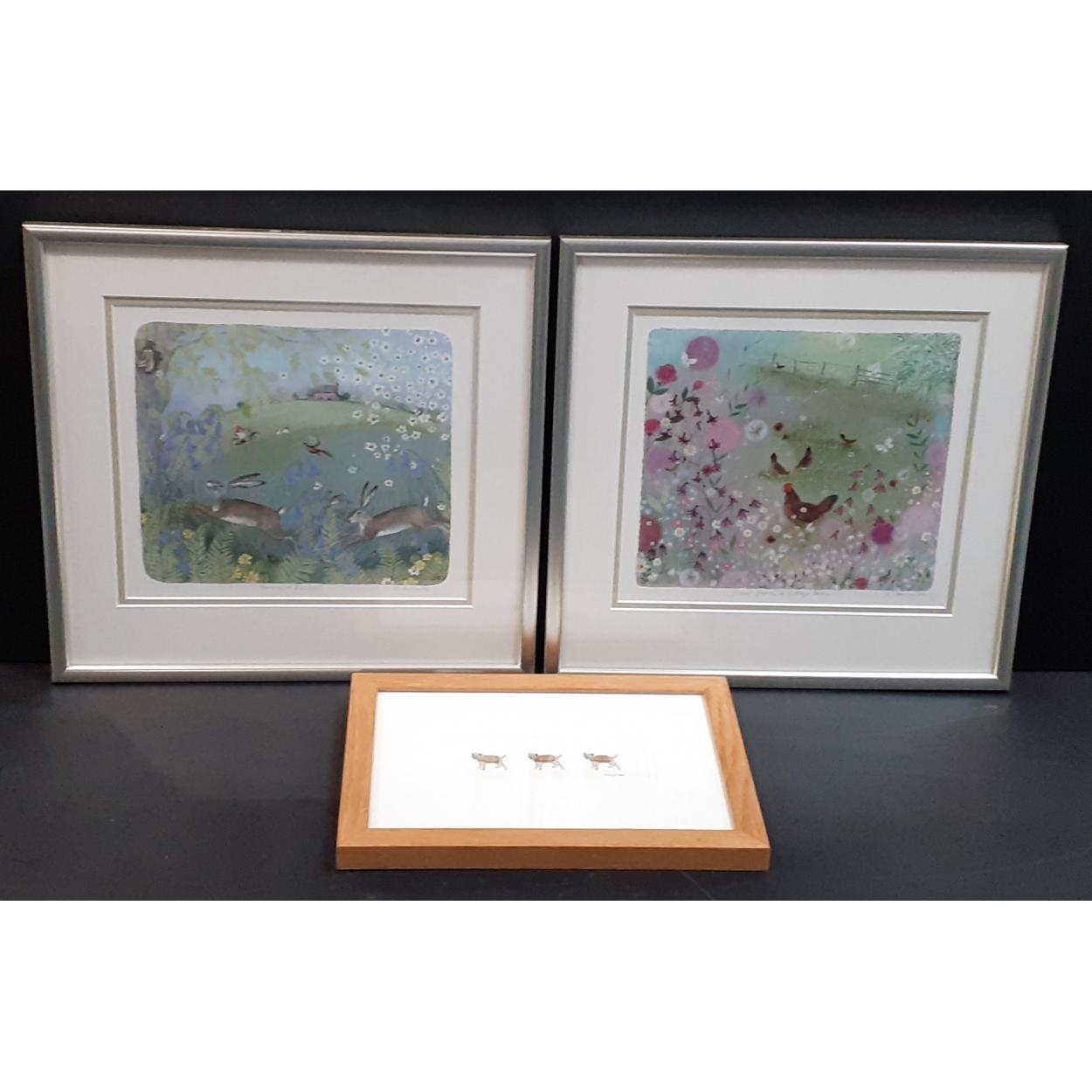 Three artworks to include two watercolour prints by LUCY GROSSMITH - a special edition of VIEW FROM A COTTAGE GARDEN (with COA) frame size 37 x 38cm, also HARES AND BLUEBELLS with COA 38 x 37cm approx and a work of 3 dogs by PENNY LINDOP frame size 30 x 22cm approx