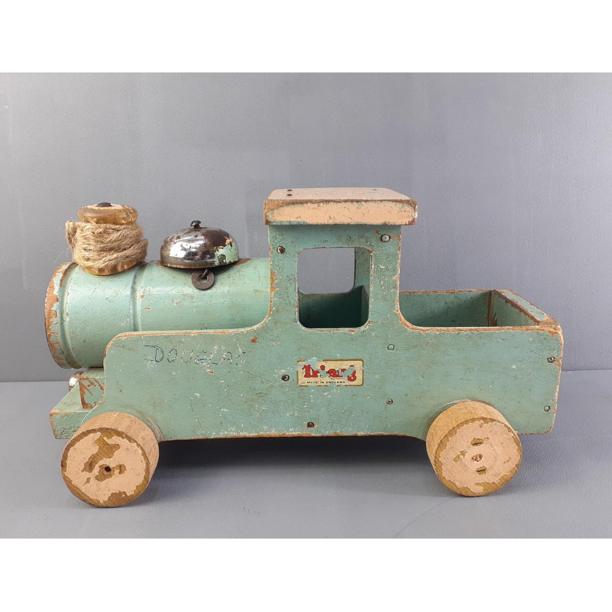 Lines Brothers TRIANG wooden pull along choo choo train. 28cm long approx. Retains decals, play worn, displays beautifully and a nice example of this vintage toy.