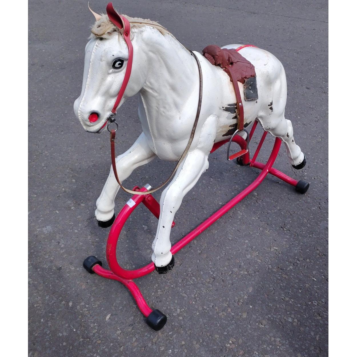 A vintage child's metal bodied rocking horse. In working order with wear to the mane. Stands 90cm tall approx