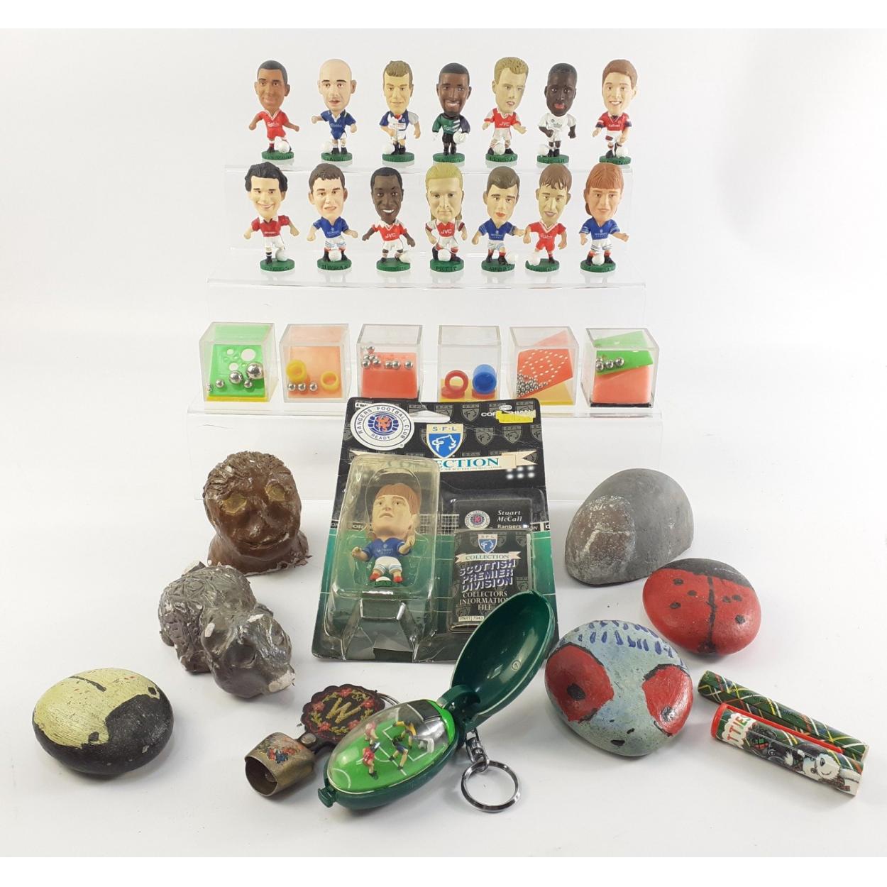 A box containing amusing footballer figures to include Stuart McCall, and others.
