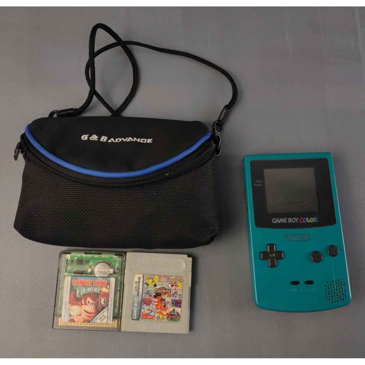 GAMEBOY COLOUR in soft carry case also with Donkey Kong cartridge and compilation game (titles include Digimon, Pokémon Jade, Spiderman). Untested