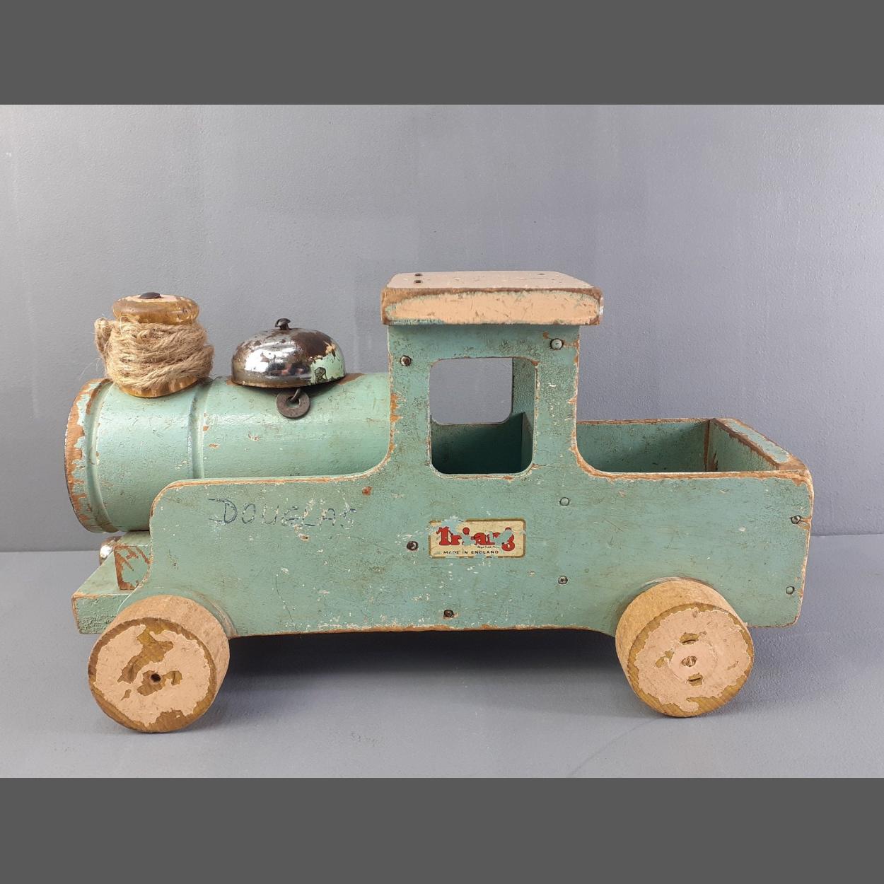 Lines Brothers TRIANG wooden pull along choo choo train. 28cm long approx. Retains decals, play worn, displays beautifully and a nice example of this vintage toy.