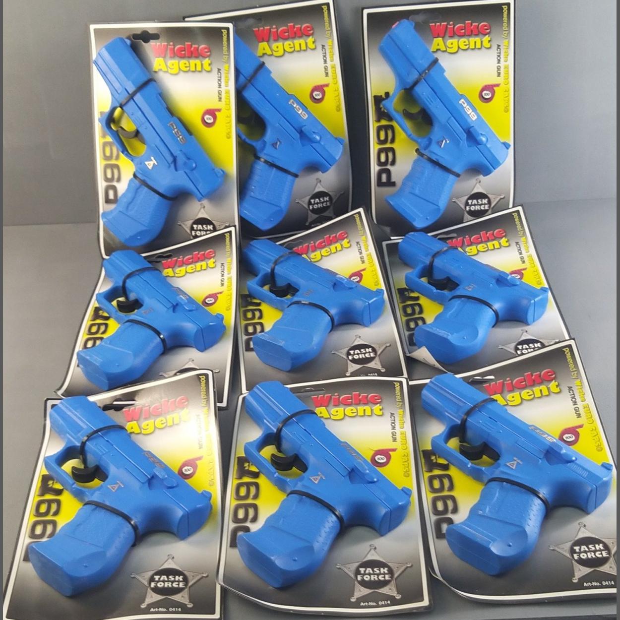 A trade box of nine WICKE AGENT P99 blue plastic cap pistol guns.