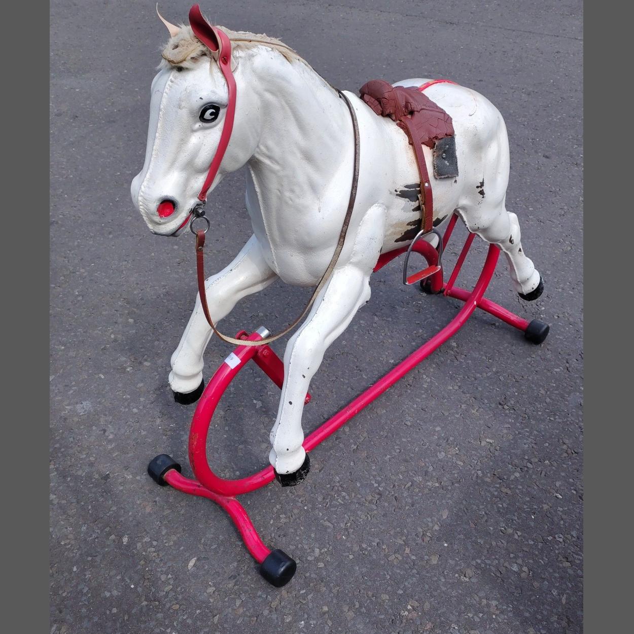 A vintage child's metal bodied rocking horse. In working order with wear to the mane. Stands 90cm tall approx