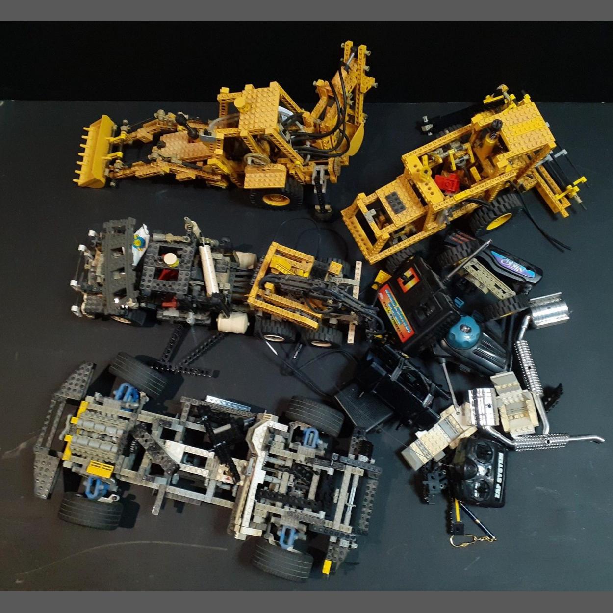Four LEGO TECHNIC models - combine harvester, truck, JCB digger, and a race car. All missing some pieces.