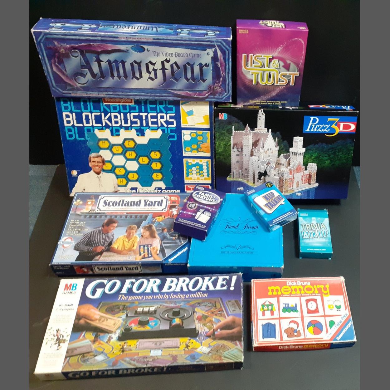 A collection of board games including BLOCKBUSTERS, SCOTLAND YARD, TRIVIAL PURSUIT, FAMILY FORTUNES and a 3-D jigsaw of an Alpine castle