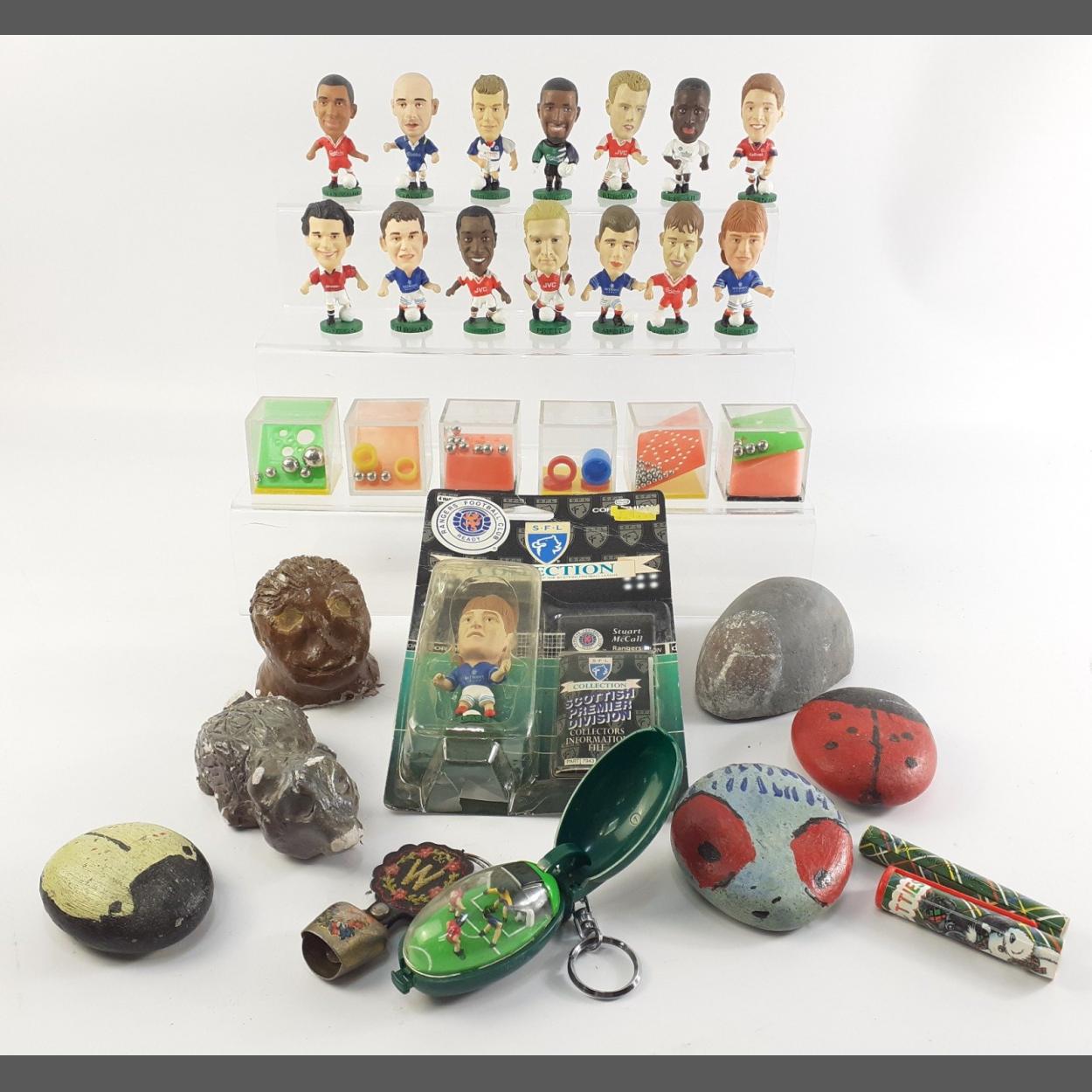 A box containing amusing footballer figures to include Stuart McCall, and others.