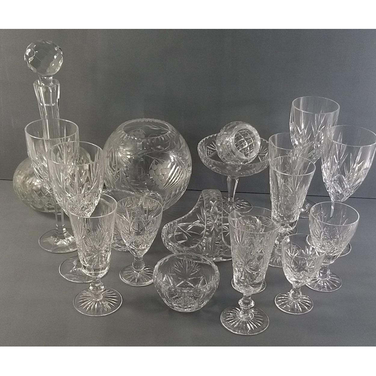 Good selection of glassware and crystal to include lovely large 30cm glass etched tray, decanter and glasses, bon bon dish, flower vases etc.