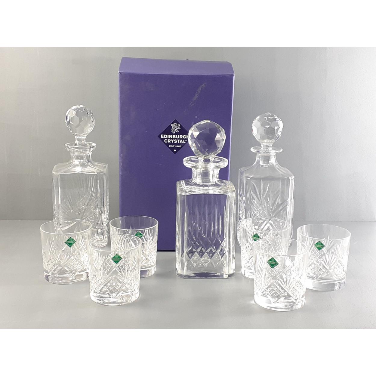 Six EDINBURGH CRYSTAL labelled whisky tumblers in lovely condition with stickers. Also three decanters and a box.