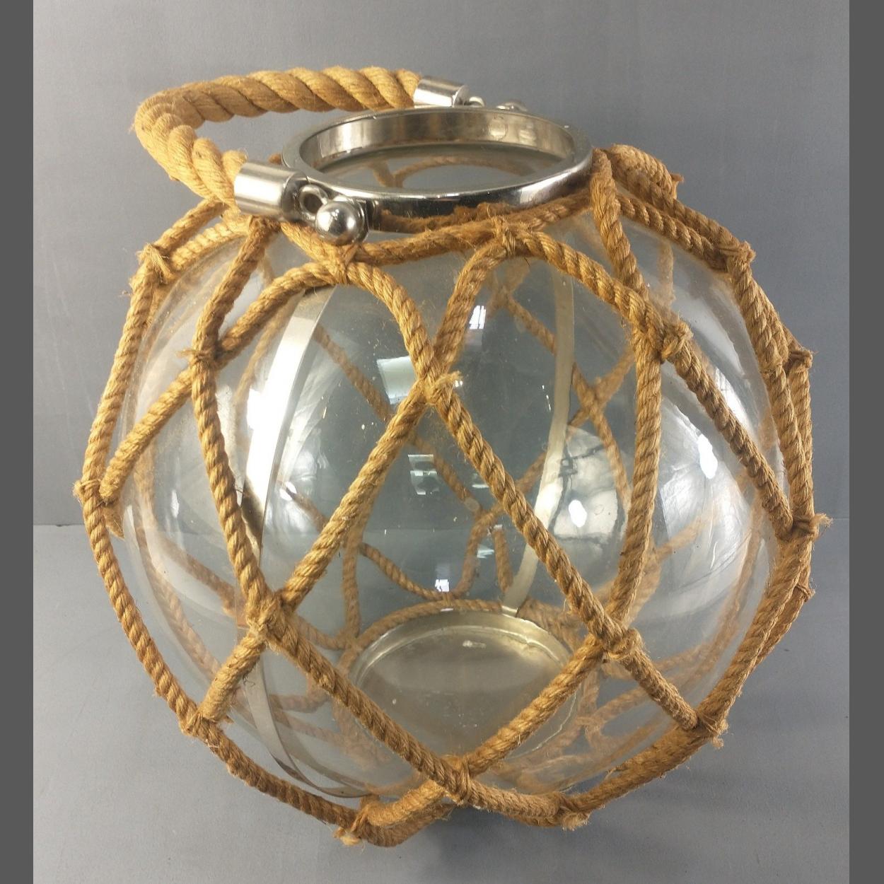 A braided rope glass globe hanging lantern 36cm tall approx. No cracks or fraying to rope etc.