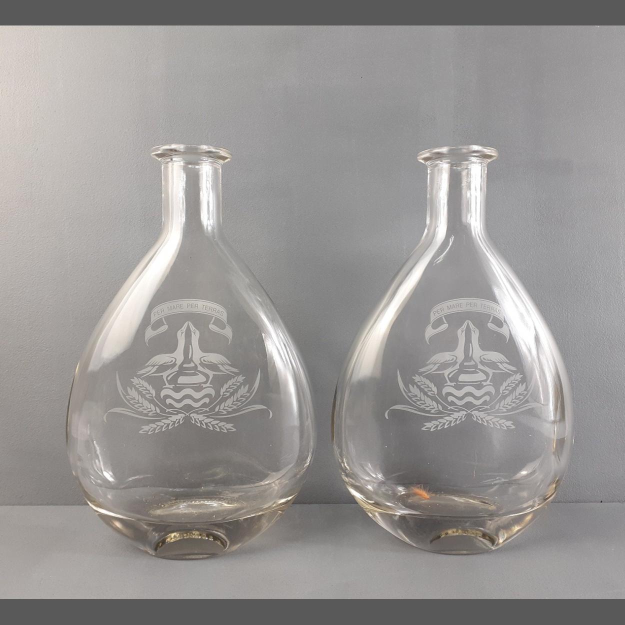Two glass decanters each 23cm without stoppers. Etched 'Per Mare Per Terras' mottos. Royal Marine interest?