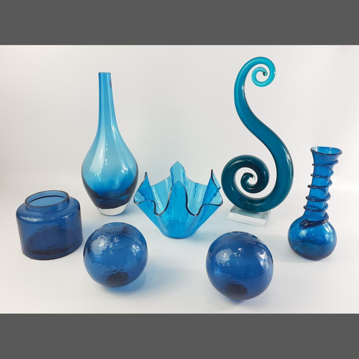A nice collection of pretty blue glass decorative pieces to include handkerchief dish, jar, vases etc.