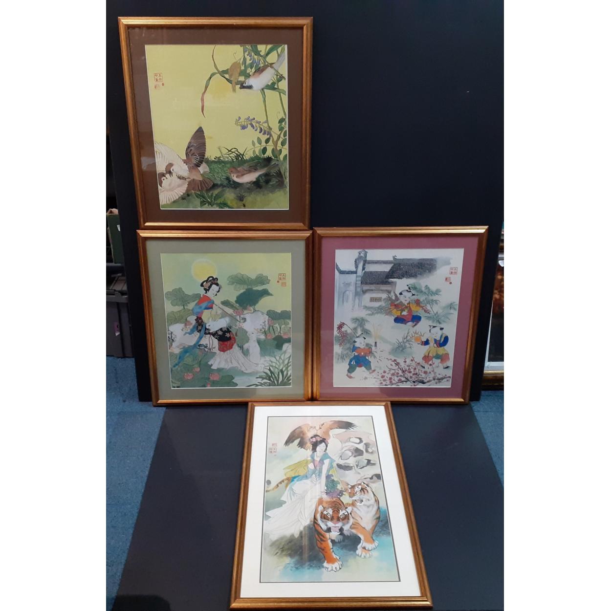 Four wonderful Oriental mix media pictures of Chinese scenes in frames. Very appealing scenes. The largest 778cm x 50cm approx.