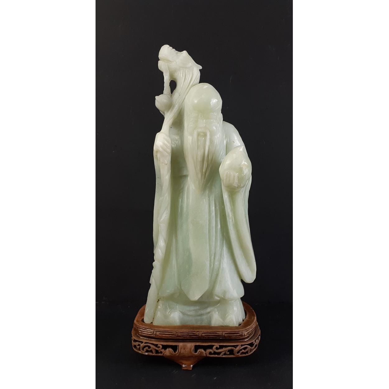 A Chinese carved jade figure of an Immortal standing approx 23cm tall with stand. Piece in good condition with no breaks or chips. Note break to foot of wooden stand.