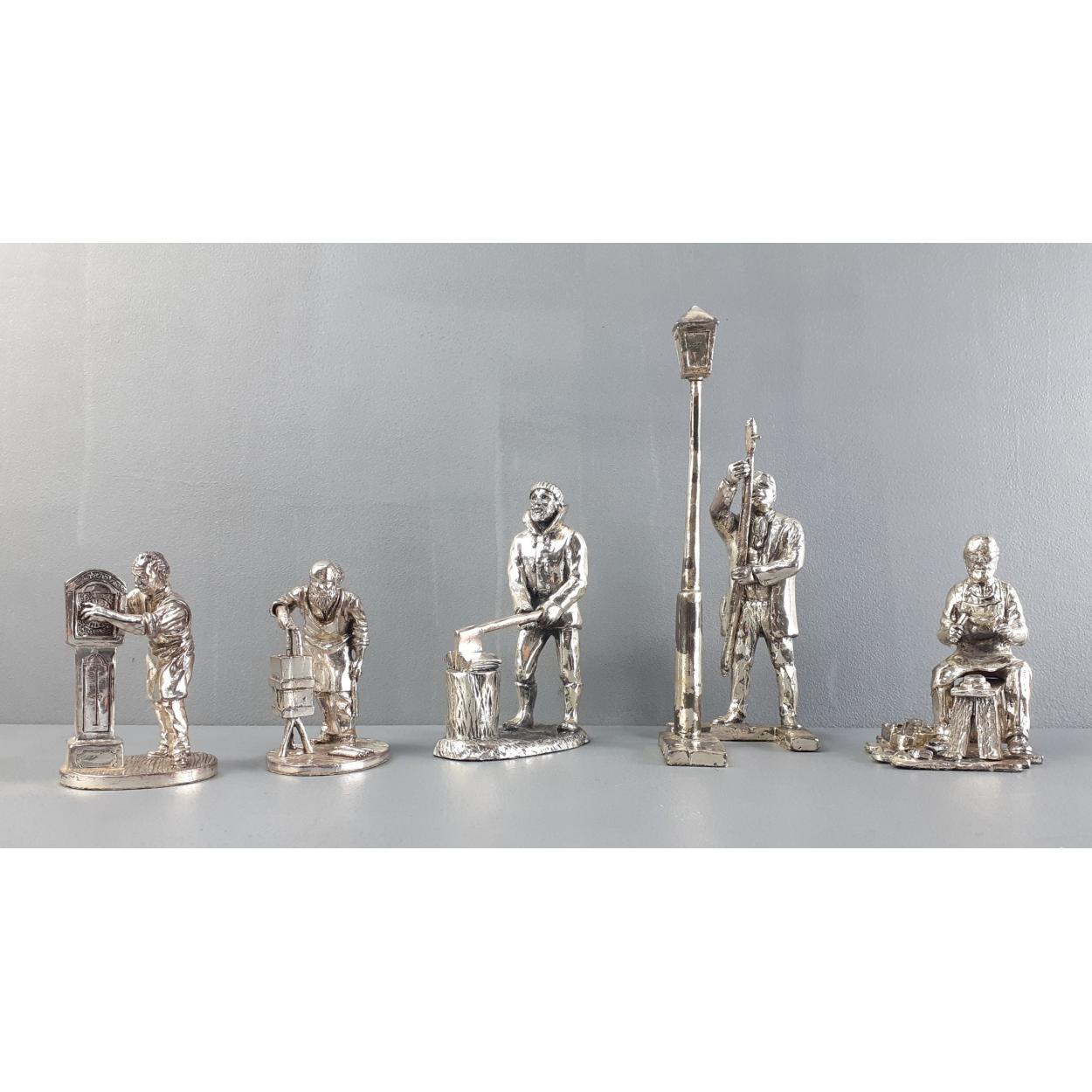 ROYAL HAMPSHIRE pewter figures. Five great pieces to include lamp lighter with light wear, woodcutter, clock service and cobbler set with detached shoe.