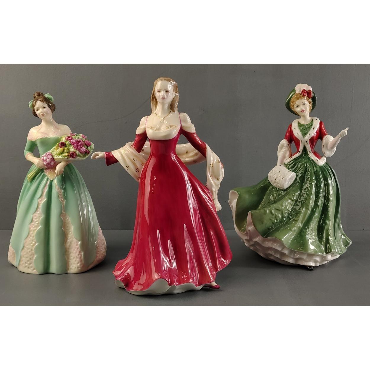 Three ROYAL DOULTON LADIES to include Christmas Day 2000 (HN4242), Happy Birthday (HN3660), Prestige Figure of the Year 2005 Lady Sarah Jane (HN4793), tallest approx 23cm. No damage