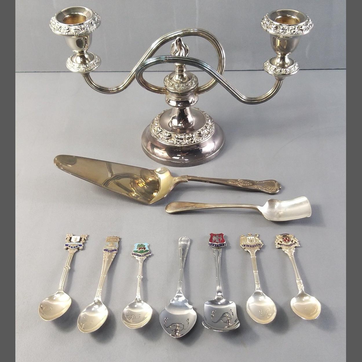A small silverware lot to include a twin-branch candelabra, a cake slice, 6 crested spoons and 2 others.