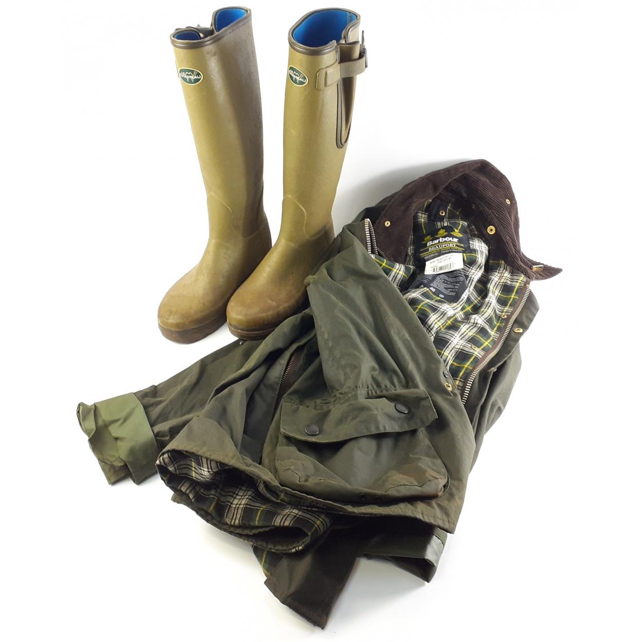 A BARBOUR Beaufort wax jacket size 107cm in good condition plus a pair of size 5 LE CHAMEAU boots.