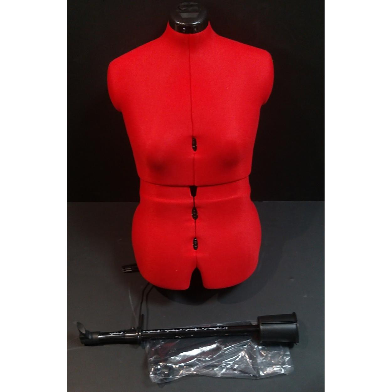 A boxed dressmaker's model on stand. Red fabric and plastic expandable. As new in box.