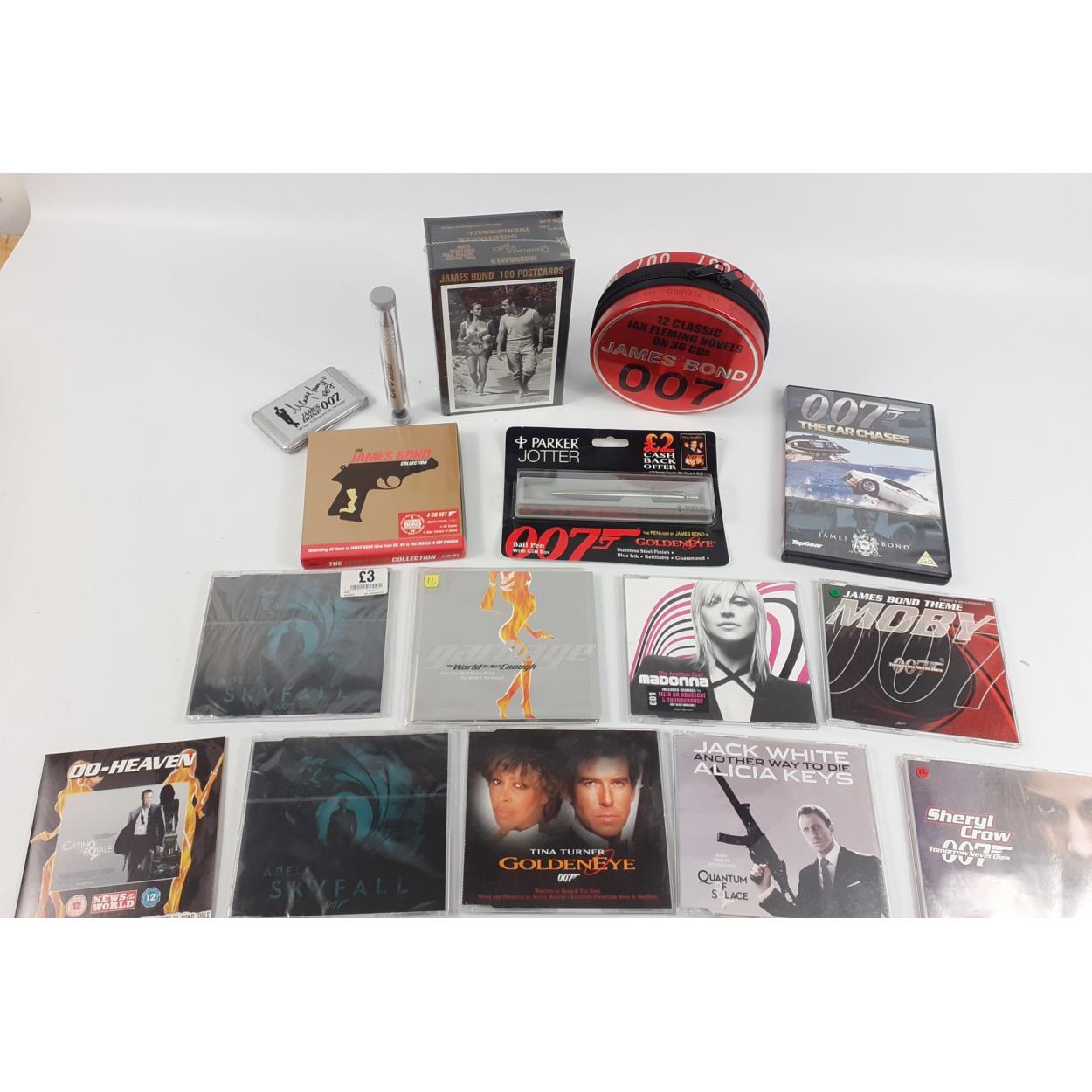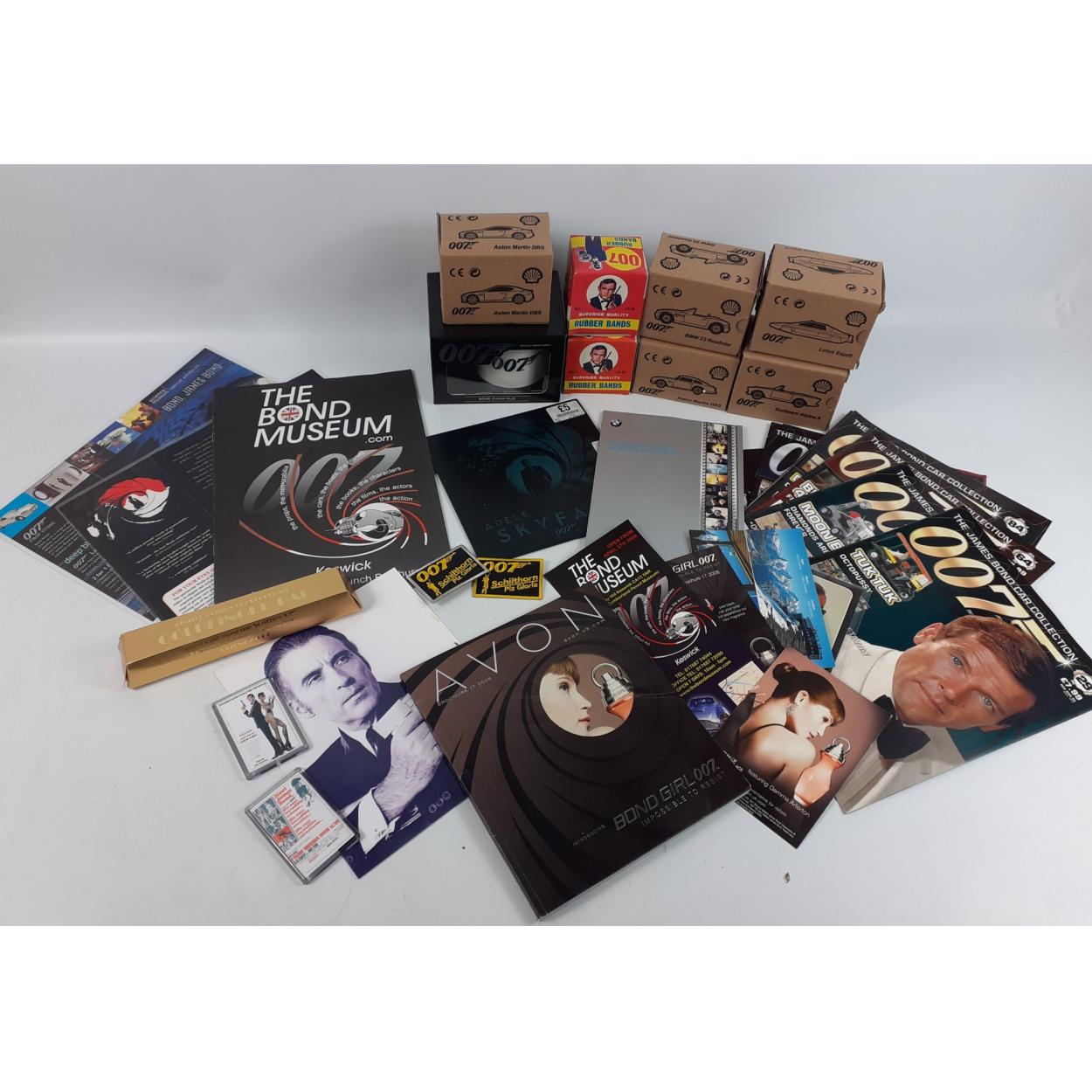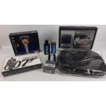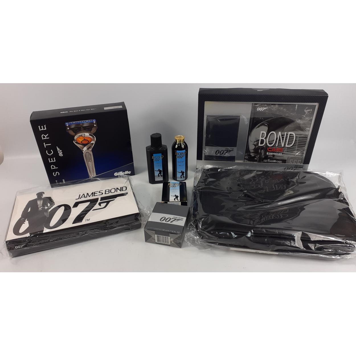 JAMES BOND toiletries to include an unopened SPECTRE razor by Gillette, 007 shampoo, bath soap, body talc, a sealed box of 50ml eau de toilette, and an unopened CASINO ROYALE wash bag to put it all in, plus a sealed presentation pack of the book of Bond Cars & Vehicles along with a 125ml bottle of James bond 007 eau de toilette, and a 007 laptop bag still in wrapper