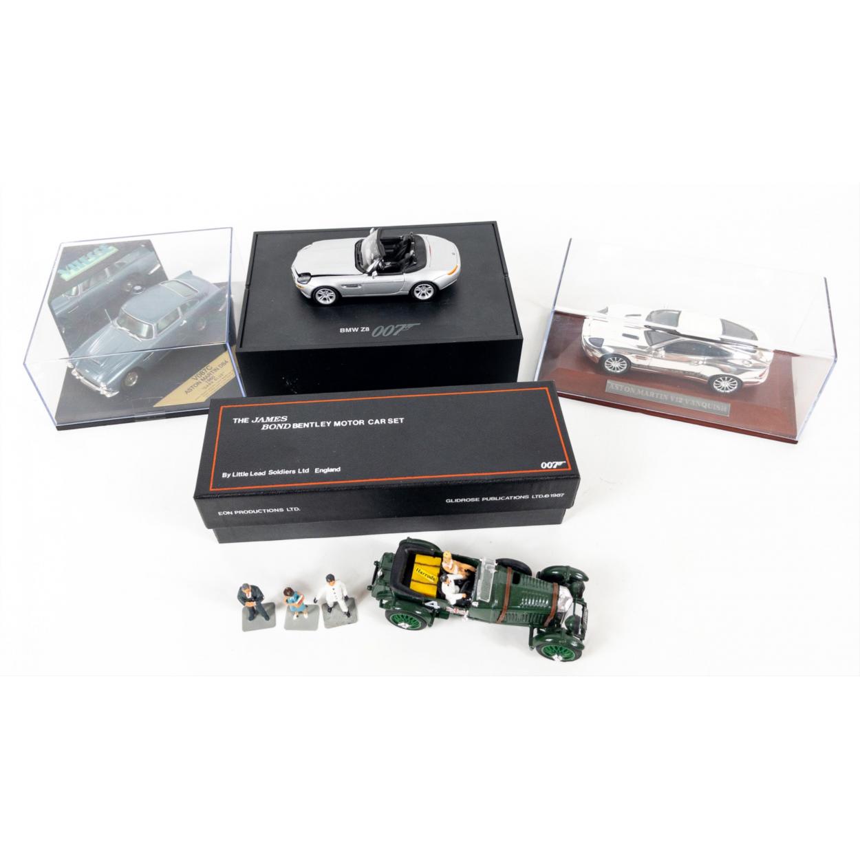 JAMES BOND - Vitesse V087C Aston Martin DB4 1960 dark blue in Perspex case, plus an Aston Martin V12 Vanquish metallic silver in a Perspex display case (case measures 14.5x7x7cm), a boxed 007 BMW Z8 with built-in display stand, and a James Bond Bentley Motor Car Set, boxed with figures