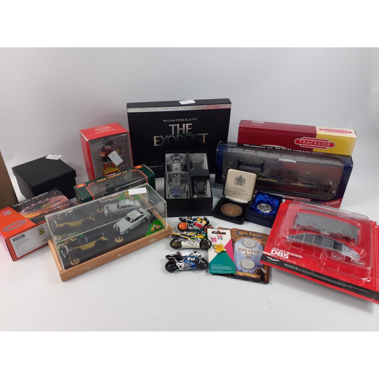 A mixed box to include a 1:1000 model of YAMATO 1945, an EDDIE STOBART fork lift truck, a 2012 Olympic stadium figurine, a Monet print, a JAMES BOND diorama with Oddjob, Bond and the Aston Martin DB5, a boxed set of cut-glass mini-decanter and 2 shot glasses from The Gables Hotel Restaurant, a pyramid-shaped glass paperweight (10cm dia base), a boxed DENNIS THE MENACE figure, a boxed William Wallace bottle opener (4.5cm dia approx), a boxed Pirbright army training centre CO's competition winner medal, LLEDO Days Gone Trackside road transport, 2 parts of build-your-own JAMES BOND DB5 models, a boxed VHS tape of THE EXORCIST with book