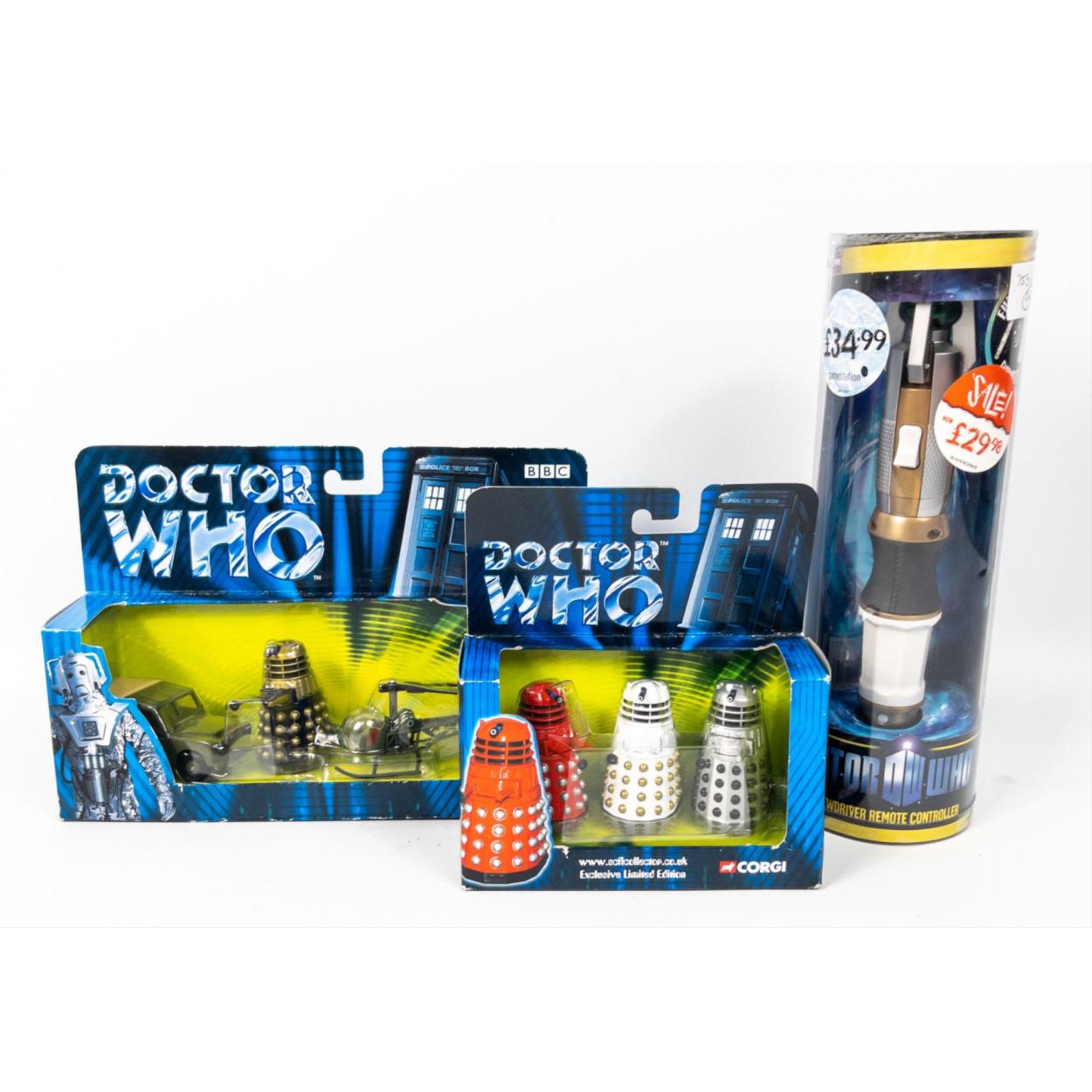 DOCTOR WHO - exclusive limited edition CORGI 3 piece Dalek set (CP96210) and CORGI Dr Who UNIT set with Land Rover, Bell H47 helicopter and Gold Dalek set (TY960206) both unopened with slight damage to boxes and a Doctor Who sonic screwdriver remote controller compatible with Wii