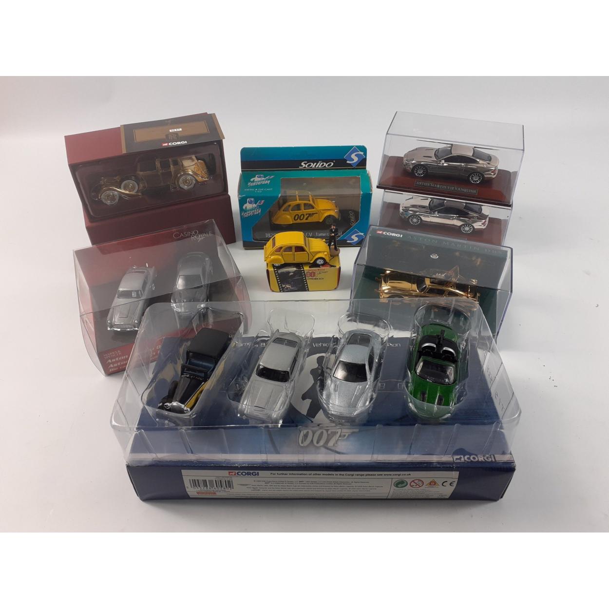 A collection of JAMES BOND boxed model cars to include a CORGI Citroen 2CV and a similar by SOLIDO a CORGI boxed set of 4 DIE CAST cars from Goldfinger and Die another Day, two small ASTON MARTIN V12 VANQUISH presented in perspex cases , a gold Corgi ASTON MARTIN DB5 and two ASTON MARTINS produced for M&S. also includes An unopened limited edition CORGI Gold Plated 1937 ROLLS ROYCE Sedanca De Ville the 13cm model is number 3647 of a worldwide edition of 5000 and comes with certificate