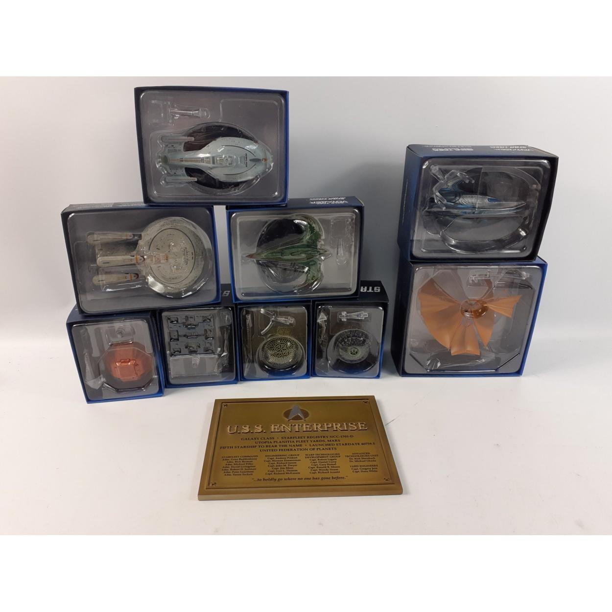STAR TREK - collectable die-cast models by EAGLEMOSS to include Suliban cell ship - (5555-A/A), Fesarius (6240-A/A), Borg Tactical Cube (8882-A/A), Borg Sphere (0082-A/D), USS Enterprise NCC-1701-D (AGT) (4209-A/A), Xindi Insectoid Vessel (6213-A/I), USS Voyager NCC-74656 (4852-A/B), Orion Interceptor (0064/A/A), Bajoran Lightship (9504-A/B), a plaque commemorating USS ENTERPRISE NCC-1701-D (21x16cm approx)