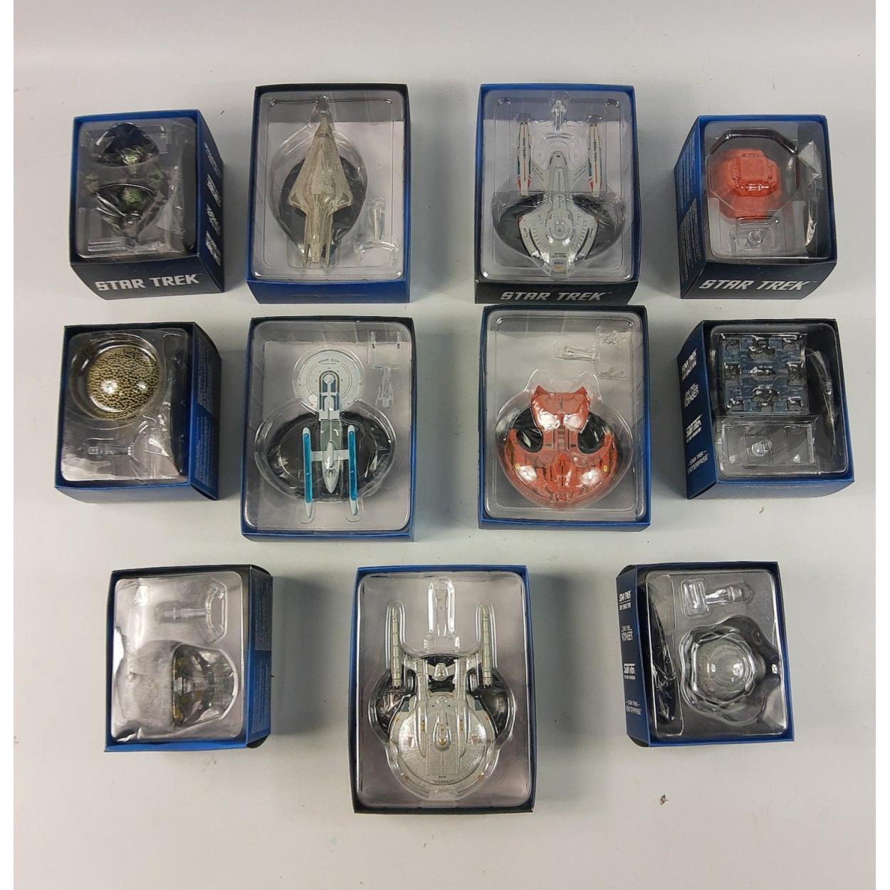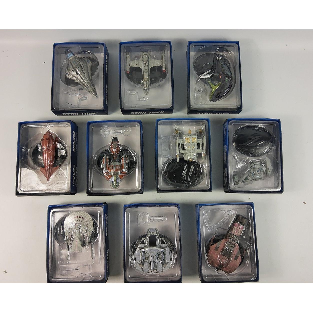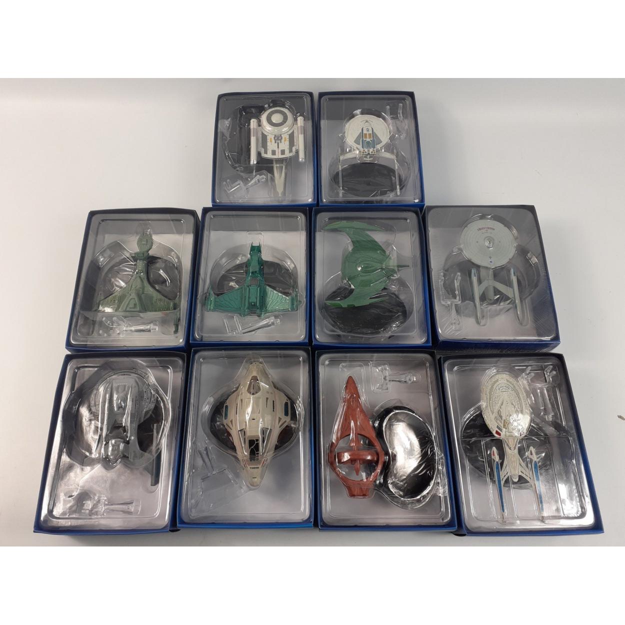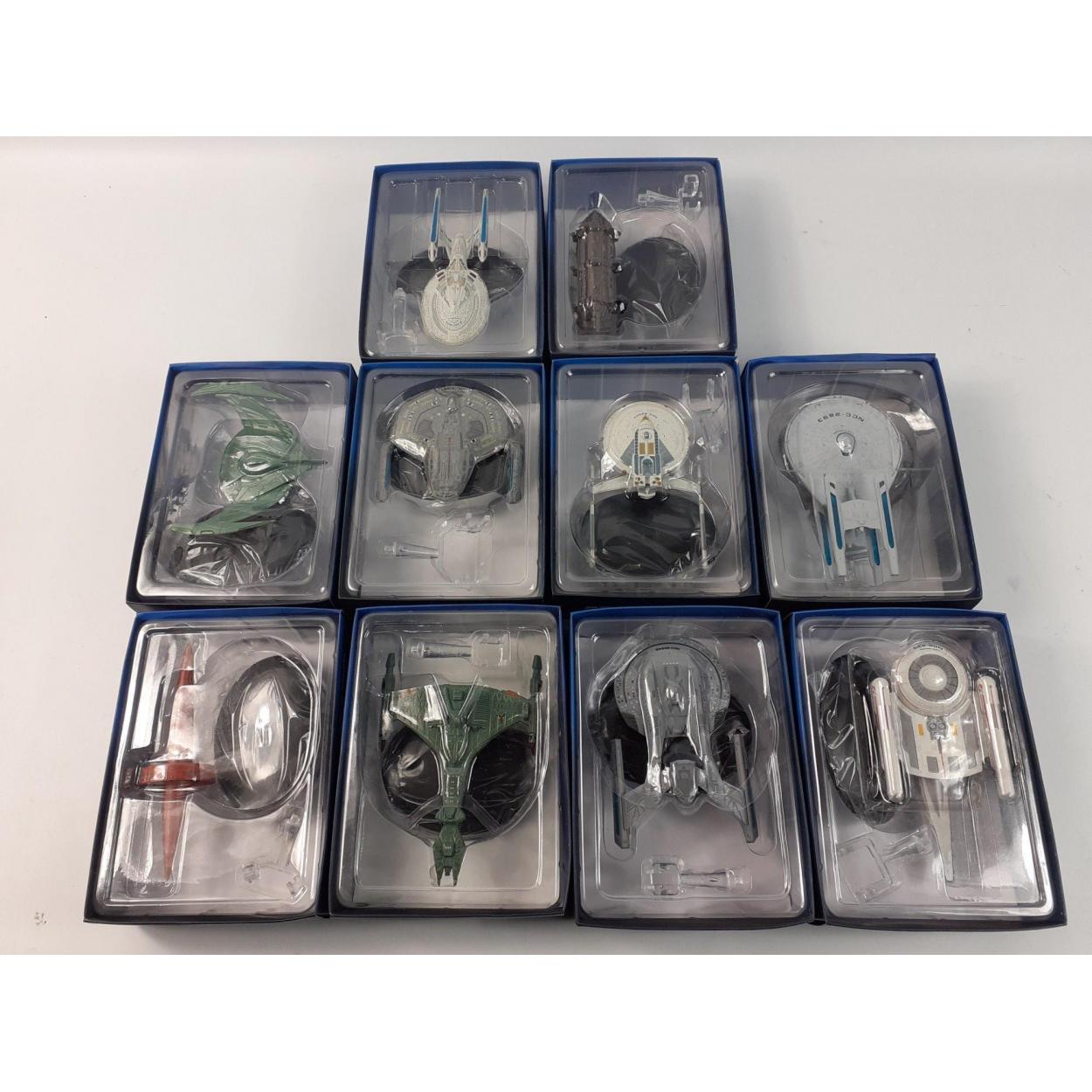 STAR TREK - collectable die-cast models by EAGLEMOSS to include USS Enterprise NCC-1701 (shrink-wrapped), Saber Class (0790-A/B), Jem'Hadar Attack Cruiser (3527-A/B), USS Voyager (Armored) (4611-A/A), Hideki Class (2690-A/B), Malon Freighter (1358-A/A), USS Reliant NCC-1864 (8584-A/B), Klingon Bird-Of-Prey (2870-A/E), Surak Class (5246-A/C), USS Prometheus NX-59650 (4951-A/J)