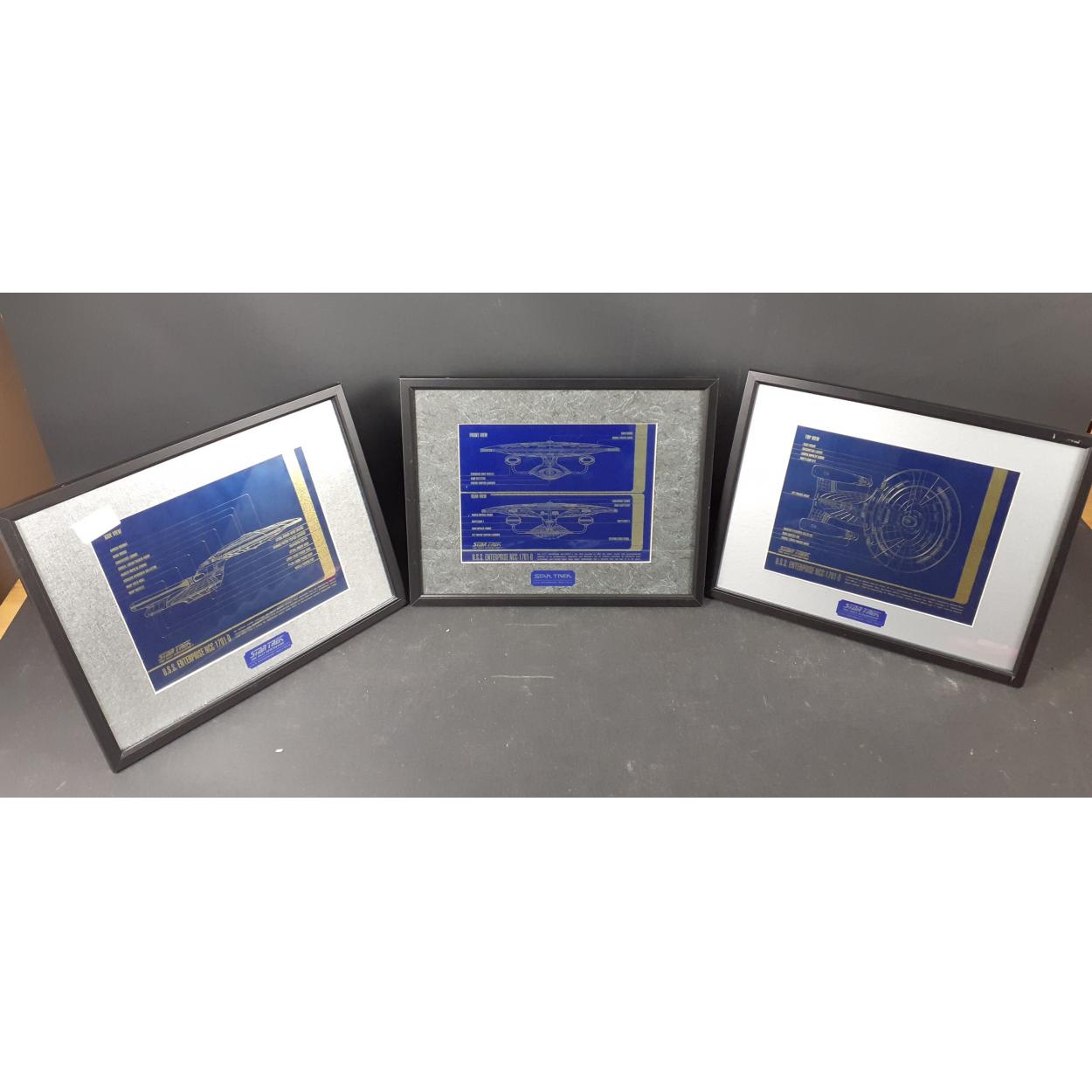 STAR TREK - three framed schematics of the USS Enterprise NCC-1701-D front view, top view and side view, each frame 38x30cm