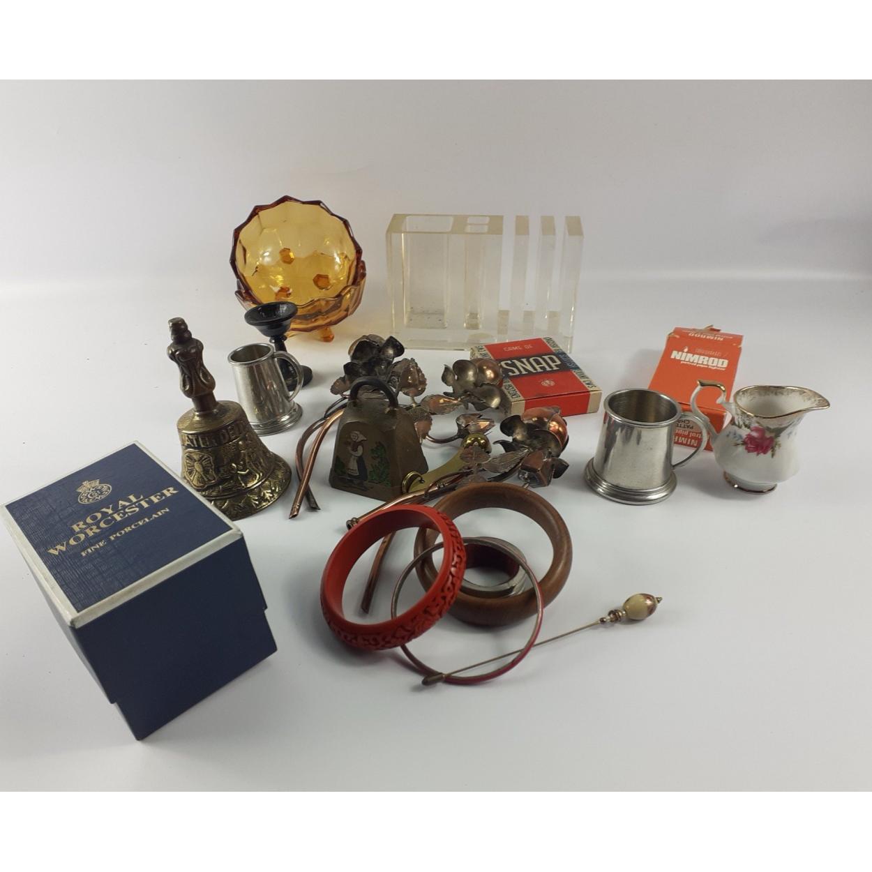 A mixed box of assorted items to include a boxed Royal Worcester porcelain egg coddler, brass bell, decorative copper flowers and others.