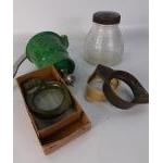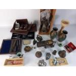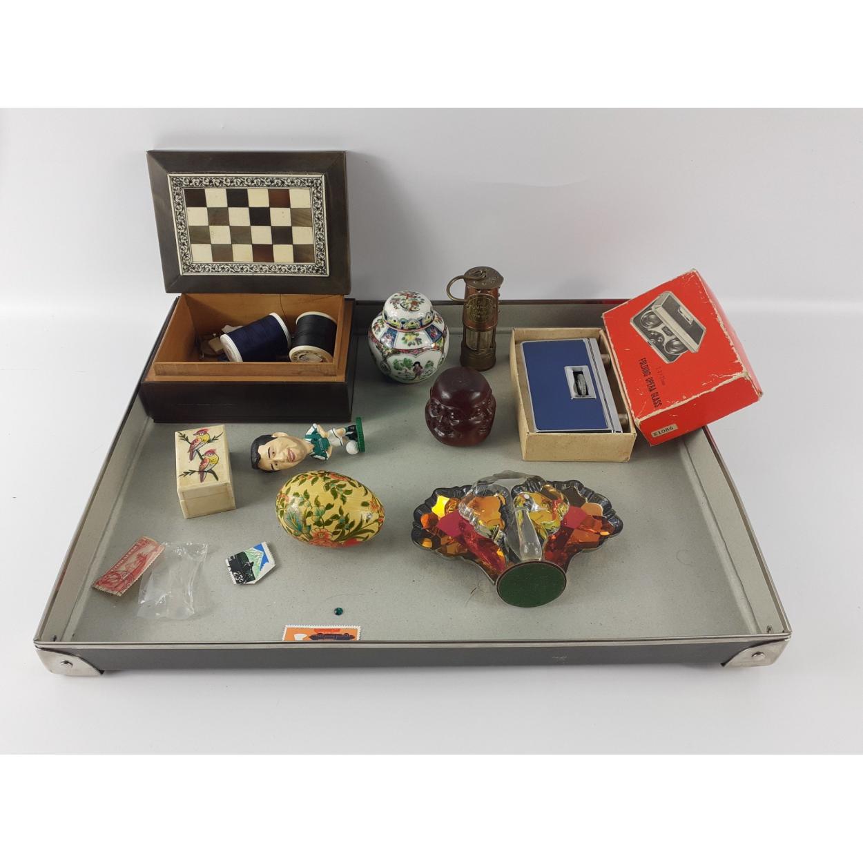 A small collection of bijouterie to include a small commemorative miners lamp, an inlaid box and others.