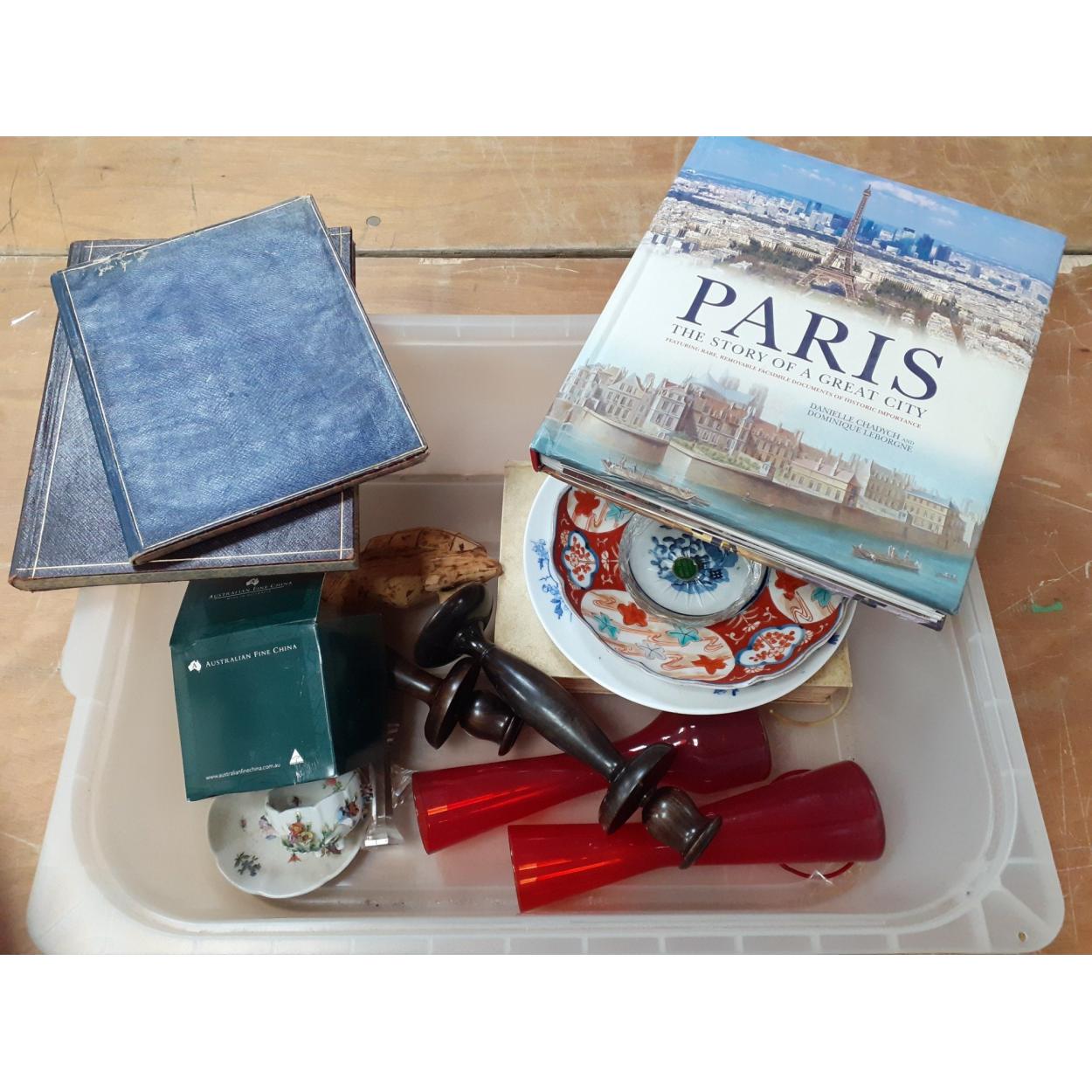 A box containing a mixed lot to include wooden candlesticks 23cm, a wooden tortoise, an Australian boxed china mug, two vintage unused notebooks, an attractive book about a Paris, assorted china and others in a useful plastic storage tub.