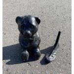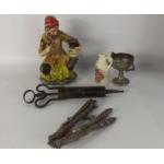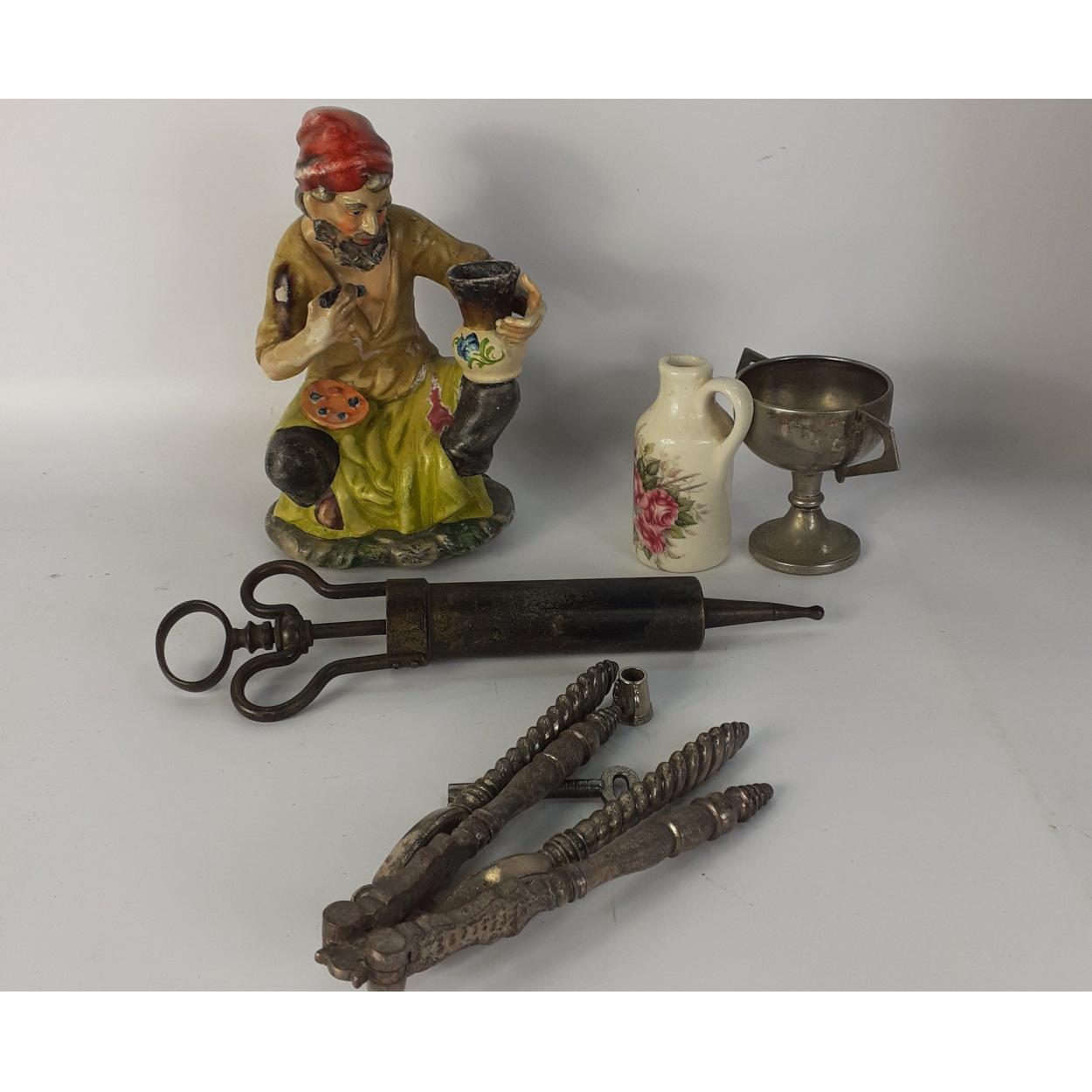 INTERESTING LOT! Small mixed lot of bric-a-brac to include a model of a potter decorating a jug, an ANTIQUE metal syringe, two pairs of nut crackers and others.