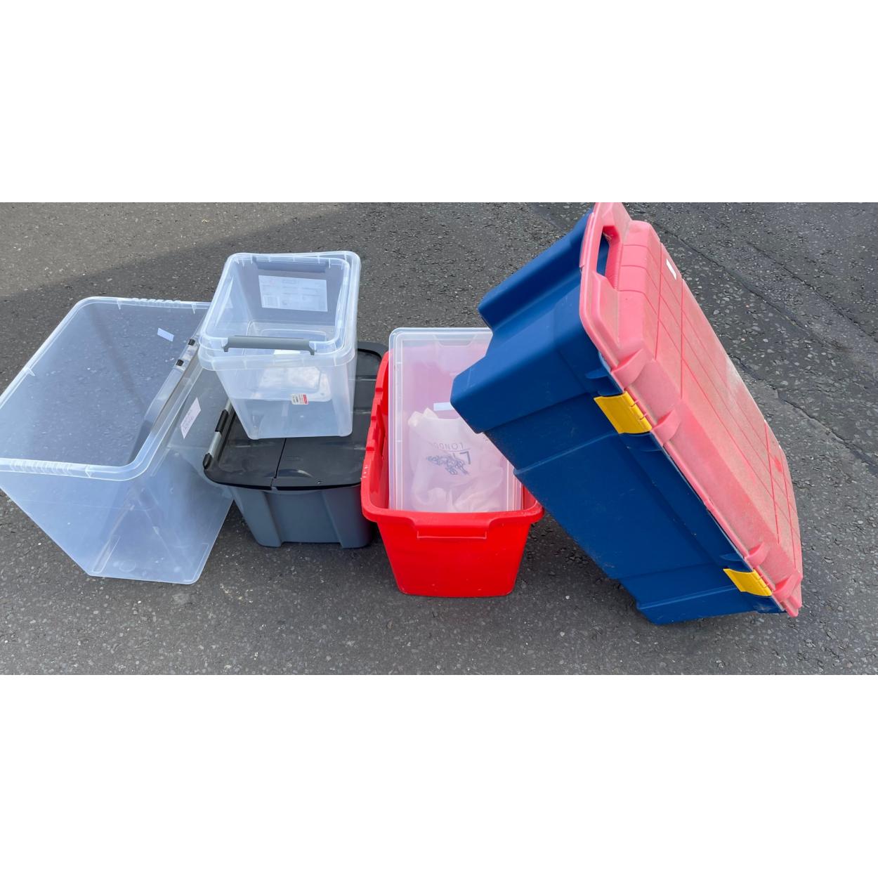 A collection of some lidded storage container boxes
