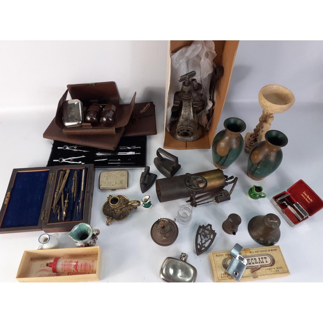 A mixed box to include a partial old steam engine, a mincer, some ornaments including a soapstone oriental piece, boxes of drawing instruments and others.