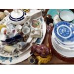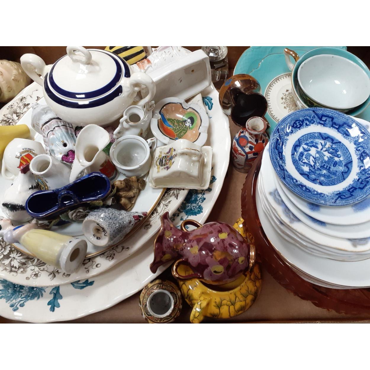 A box containing assorted china, bric-a-brac and trinkets. Includes three large plates (A/F) some useful plates, decorative pieces with some crested china and others. An interesting little lot.