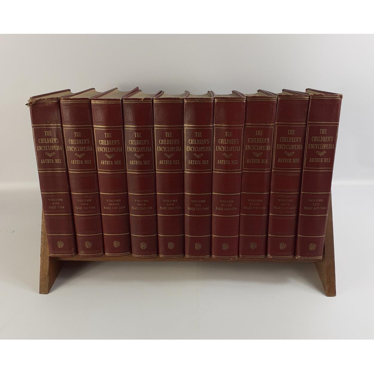 A set of ten THE CHILDREN'S ENCYCLOPEDIA by ARTHUR MEE in a display rack. Attractive lot of pretty illustrated reference books.