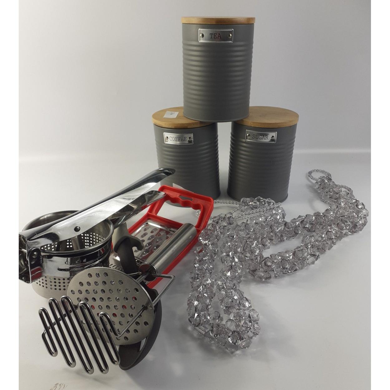 An assortment of household items to include tea/coffee/sugar cans, curtain tie-backs, kitchen utensils