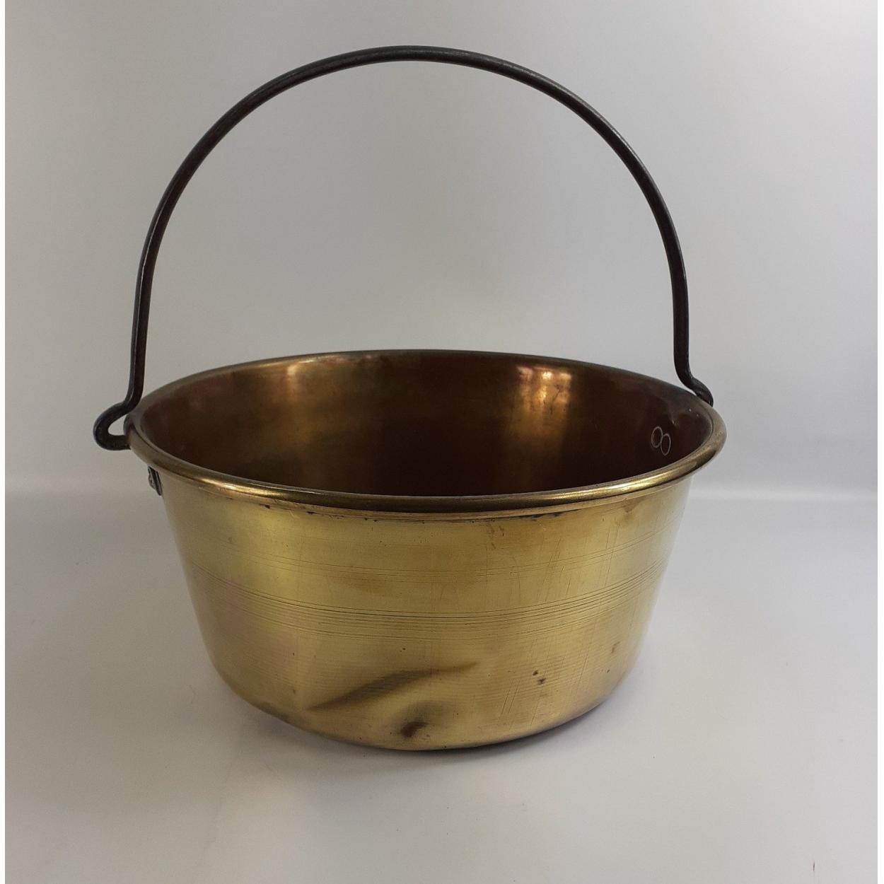 A wonderful quality antique brass jam pan with handle. A little age appropriate damage to one side but displays beautifully.