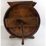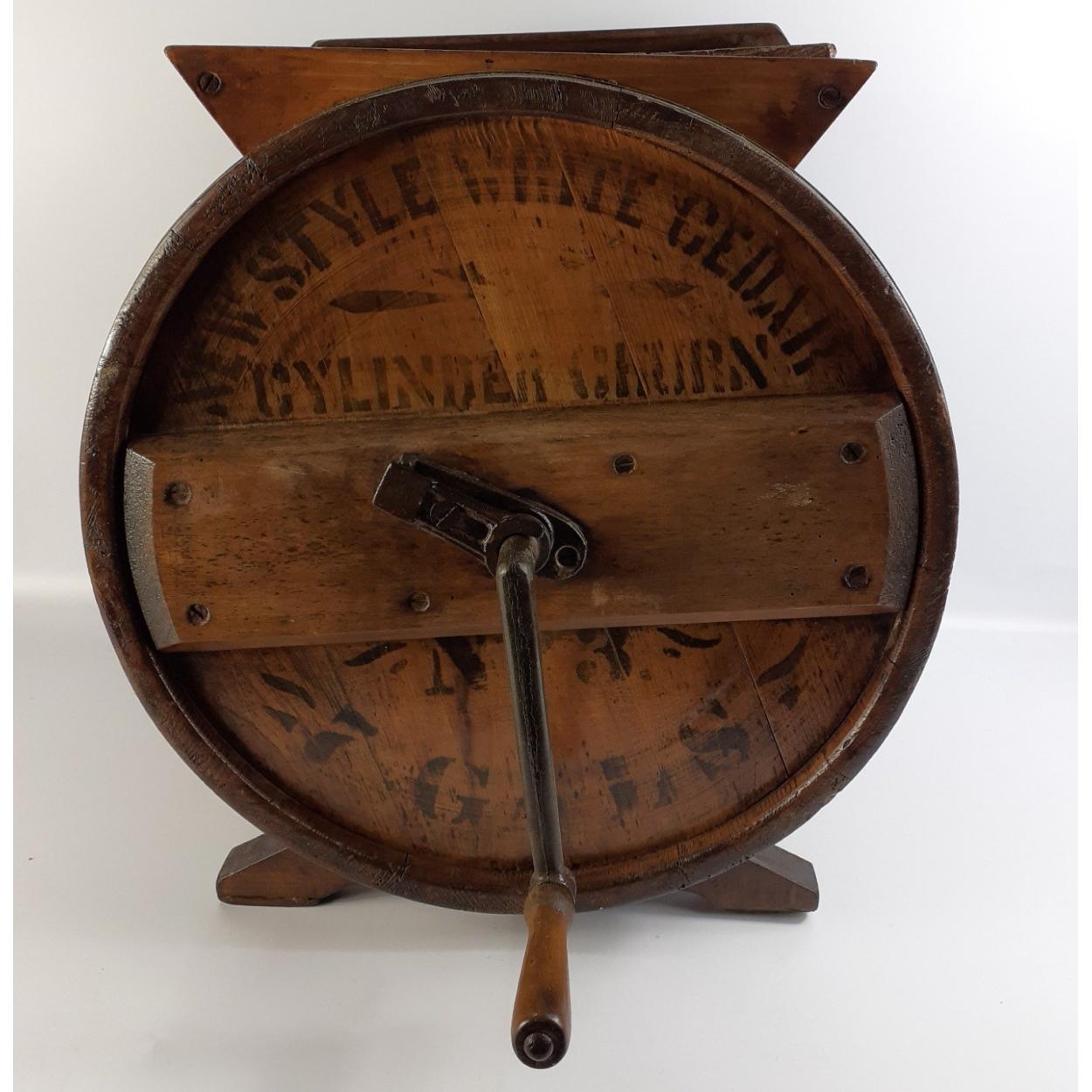 An antique butter churn marked 'New style white cedar cylinder churn number 3, seven gallons' standing 47cm high approx and in working order and in lovely condition