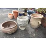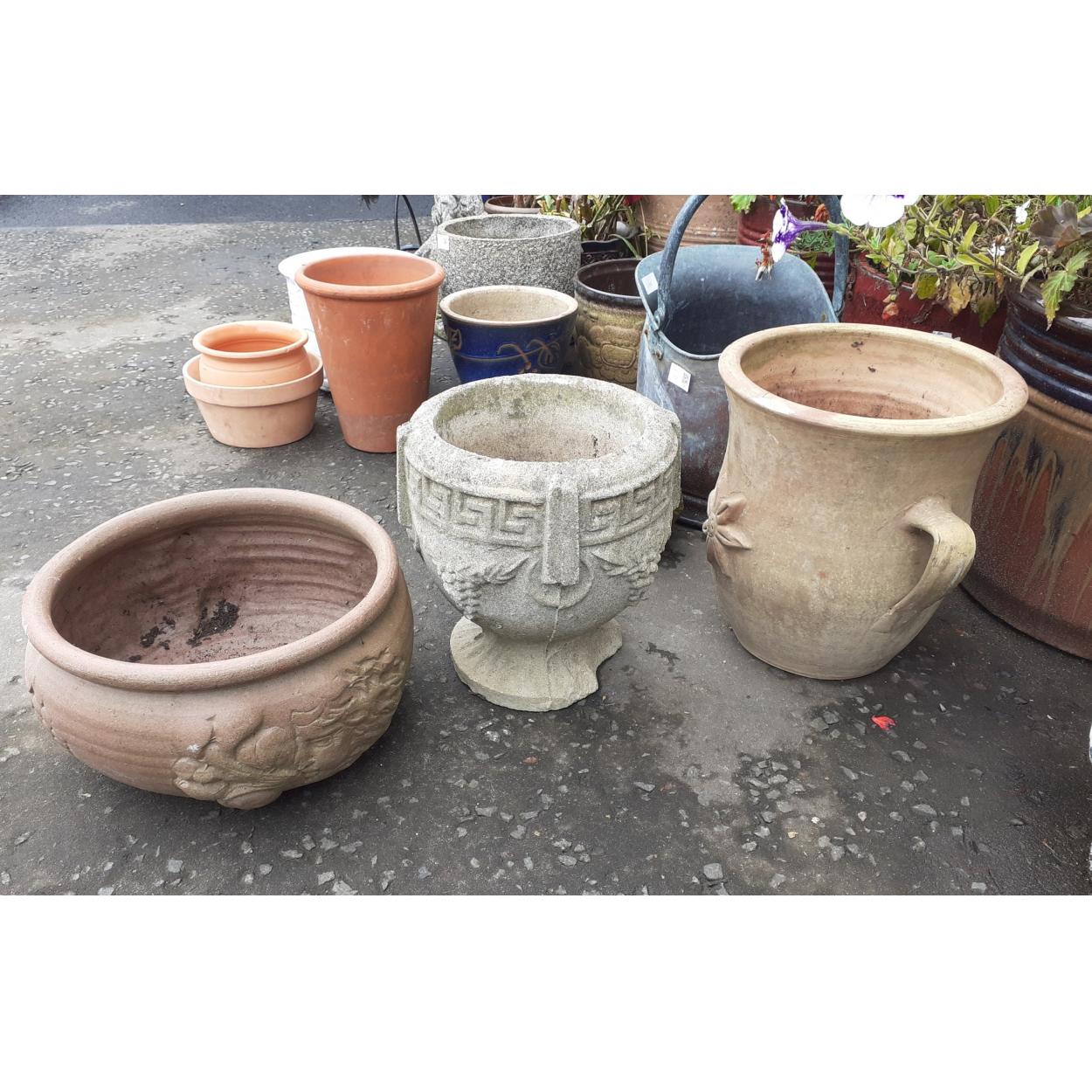 A collection of garden pots. Attractive lot for garden display includes a 28cm urn shaped one, a slightly smaller church font style with damage plus one other.