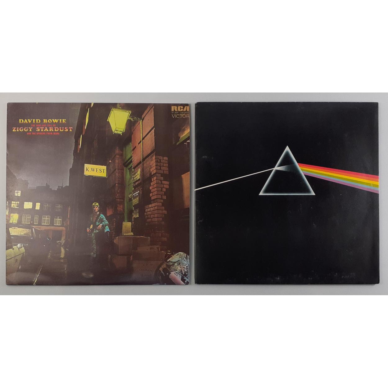 Two vinyl LP's of interest. PINK FLOYD Dark Side of The Moon and DAVID BOWIE Ziggy Stardust, Floyd without posters. Both vinyls in good used condition with light marks from use.