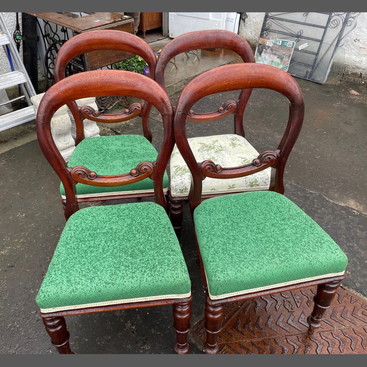 VICTORIAN mahogany balloon backed chairs set of four - three with green covers and the other with green floral cover